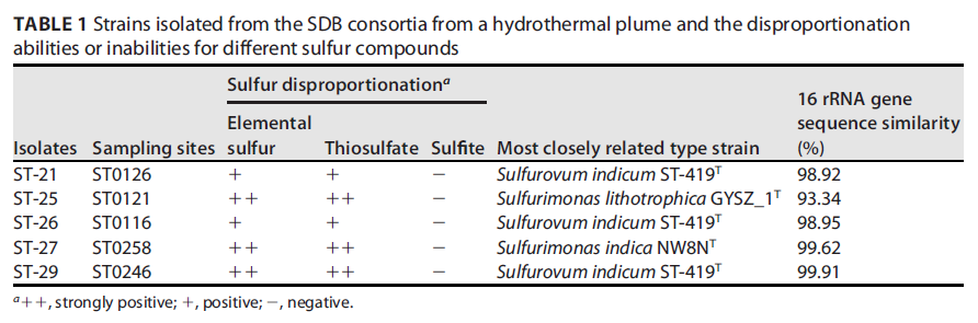 表1. 自热液羽流硫歧化富集菌群分离的菌株及其歧化不同硫化合物的能力