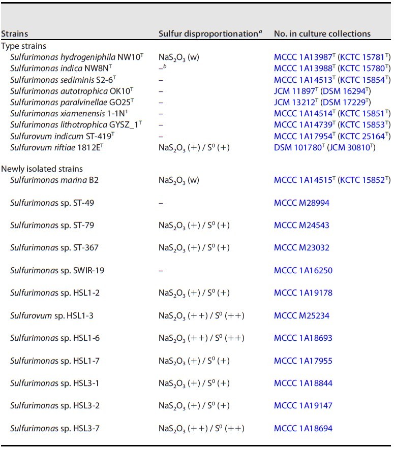 表2. Sulfurimonas和Sulfurovum两个属其他种歧化不同硫化合物的能力