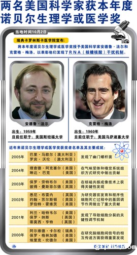 斯德哥尔摩10月2日,瑞典卡罗林斯卡医学院宣布,将2006年诺贝尔生理学或医学奖授予美国科学家安德鲁·法尔和克雷格·梅洛,以表彰他们发现了RNA(核糖核酸)干扰机制。
