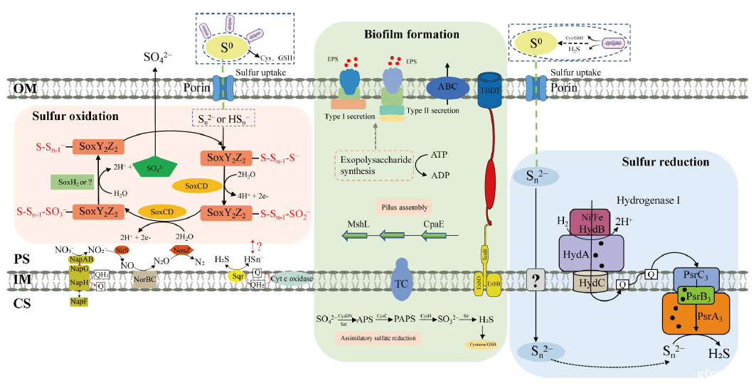OM,外膜;PS,周质空间;IM,内膜;CS胞质空间;Sox,硫氧化多酶复合体;Q,分子醌;Psr,多硫化物还原酶;TC,双组分系统;TBDT,TonB依赖型转运蛋白;关于能量保存假设反应用问号表示。