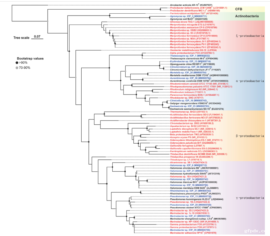 图. 深海热液区分离的铁硫氧化细菌(蓝色)与已知铁氧化菌(红色)的系统进化分析