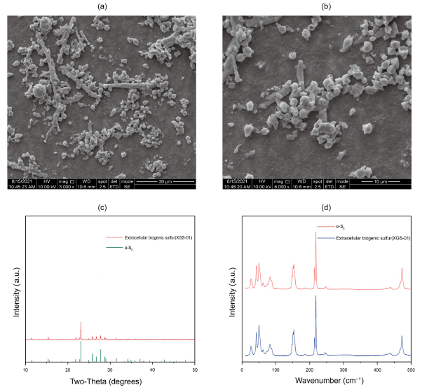 (a,b)胞外硫形态;(c)胞外硫XRD图谱;(d)胞外硫拉曼光谱