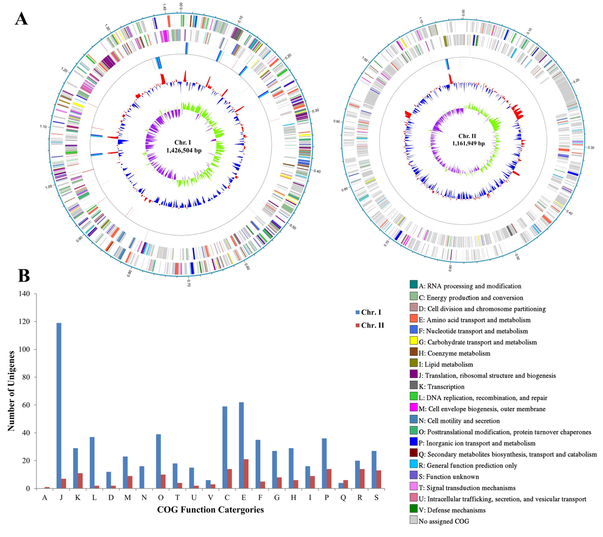 图1. 海洋侧支发光细菌,模式菌株NSCS20N07DT的基因组特征。A,两个染色体的圈图(内圈到外圈,分别是GC-skew,GC content, rrn operon, tRNA, 前导链ORFs,后随链ORFs)。B,两个染色体上COG功能分类。