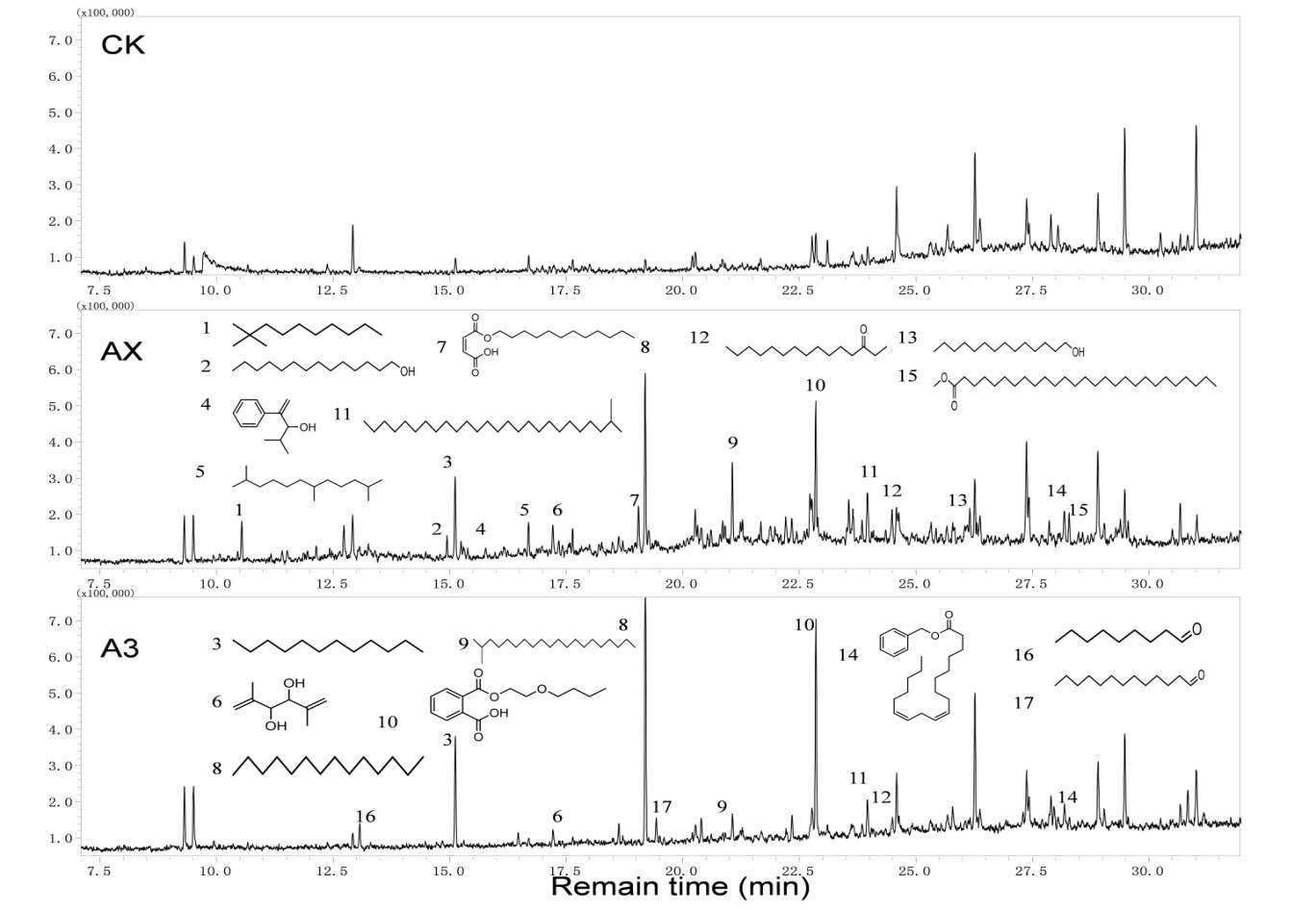 图 2. 降解30天后的培养上清液的气相色谱-质谱(GC-MS)分析