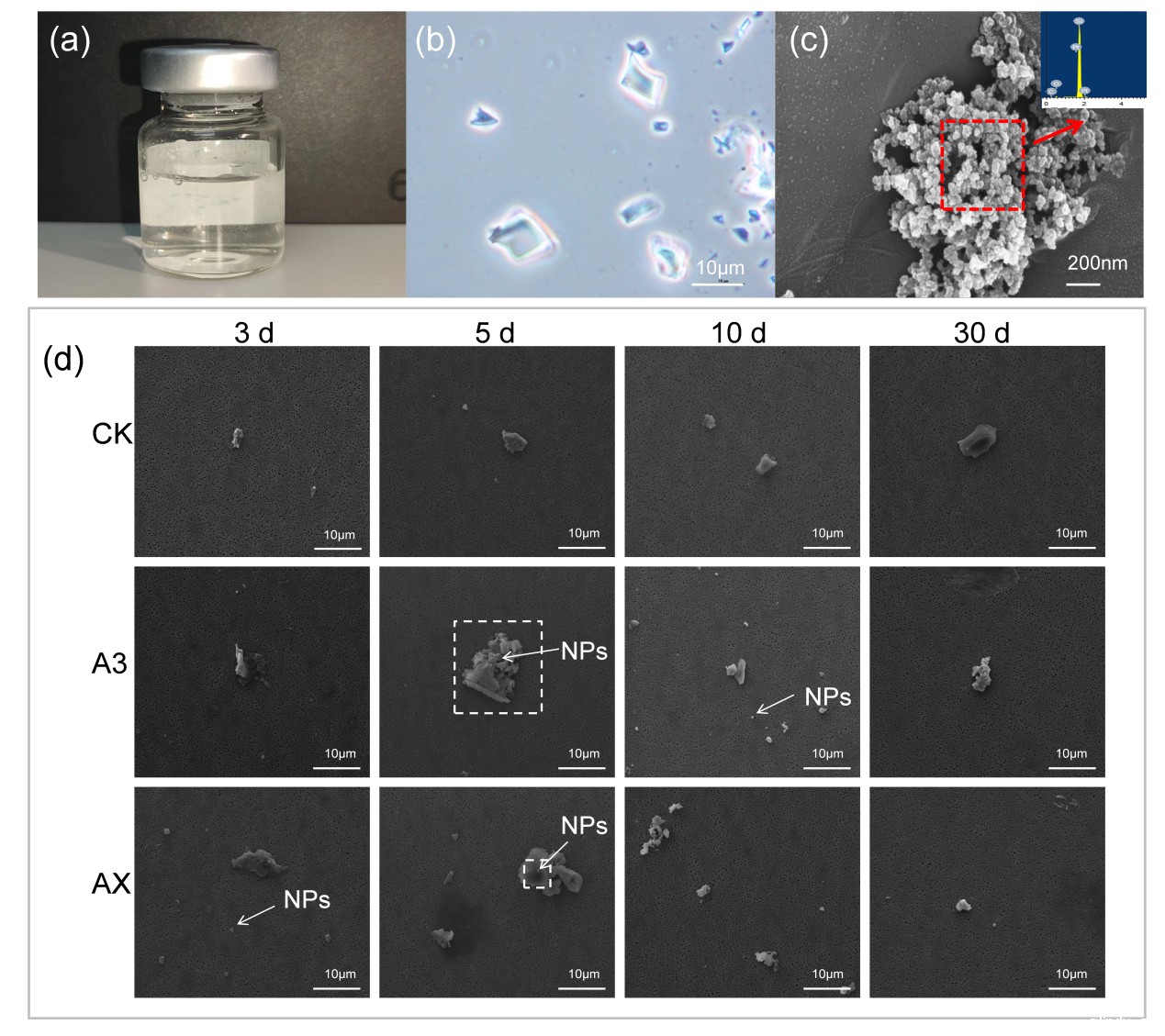 (a)超纯水中的微塑料;(b)微塑料的光学显微镜观察;(c)细菌降解后释放的纳米塑料的扫描电镜图像。插图显示了相应的EDS结果;(d)在3、5、10和30天中PS薄膜释放微塑料的形态。